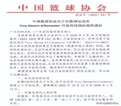 在国家体育总局反兴奋剂中心于2025年4月16日实施的赛内兴奋剂检查中,你单位男子篮球运动员吉伦沃特的A样本尿样检测结果呈大麻酚类(羧基四氢大麻酚)阳性。