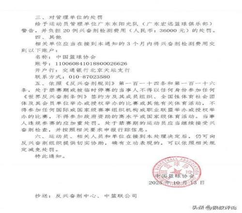 收到阳性通知后,运动员本人提出了书面听证申请。同时,山东高速篮球俱乐部依照国家体育总局《体育运动中兴奋剂管制通则》,向中国篮协和反兴奋剂中心提交了书面情况说明和相关证明材料。