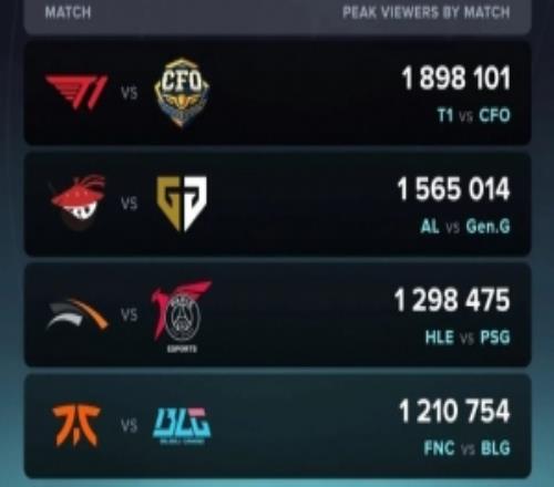 瑞士轮第二日海外收视:T1战CFO最高189W,AL战GEN次之